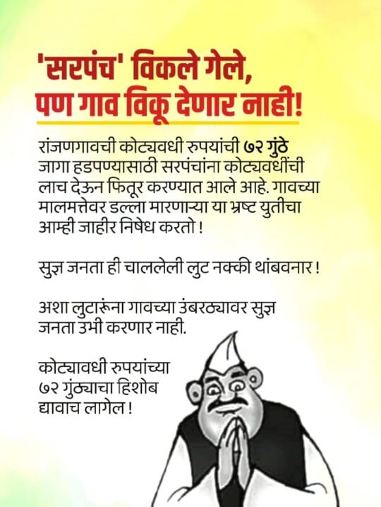 विरोधी पक्षांच्या नेते, कार्यकर्ते यांच्याकडून सोशल मिडियावर एक पोस्ट व्हायरल होताना दिसत आहे. या पोस्ट मध्ये असे नमूद करण्यात आले आहे की, ‘सरपंच विकले गेले पण गाव विकू देणार नाही. असा मोठ्या अक्षरात मथळा तयार करण्यात आला असून पुढे त्यांनी असे नमूद केले आहे की, रांजणगाव ची कोट्यावधी रुपयांची 72 गुंठे जागा हडपण्याची सरपंच यांना कोट्यावधीची लाच देऊन फितूर करण्यात आले आहे. गावच्या मालमत्तेवर डल्ला मारणाऱ्या या भ्रष्ट युतीचा आम्ही जाहीर निषेध करतो. सुज्ञ जनता ही चाललेली लूट नक्की थांबवणार ! अशा लुटारू यांना गावाच्या उंबरठयावर सुज्ञ जनता उभी करणार नाही. कोट्यावधी रुपयांच्या 72 गुंठयाचा हिशोब द्यावाच लागेल.’